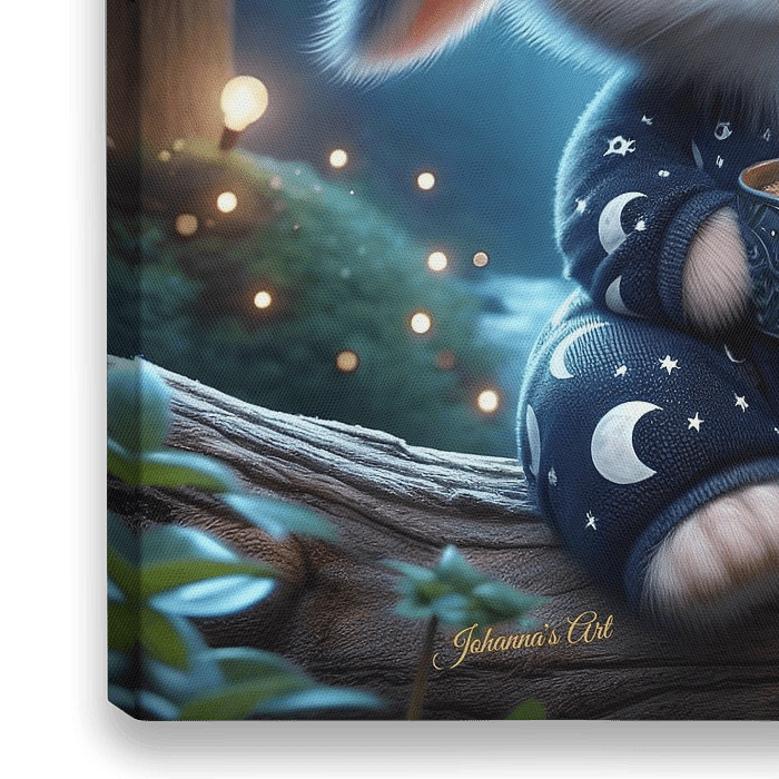 Een schattig geanimeerd konijntje met grote blauwe ogen en een pluizige vacht zit op een houten tak en houdt een dampende beker vast. Het draagt een pyjama versierd met manen en sterren, tegen een magische bosachtergrond met gloeiende lichtjes en vuurvliegjes.