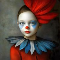 Een ontroerende afbeelding van een jong meisje geschminkt als een elegante clowntje, haar gezicht subtiel versierd met delicate schmink die haar gelaatstrekken accentueert zonder het speelse karakter te verliezen. Ze draagt een opvallende kraag van zachte blauwe veren die haar gezicht omlijst, en een haarband met rode veren die een…