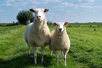 Schattige schapen, lam en ooi, staand op een dijk in de zon in grasland. Lente