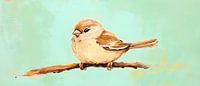 Een zacht gevederd schepsel zit dromerig op een eenvoudige tak, omringd door een tere kleur groen die rust en sereniteit uitstraalt. De fijne details en warme kleurschakeringen geven leven en harmonie aan de afbeelding. Ideaal voor de slaapkamer om een vredige, uitnodigende sfeer te creëren.
