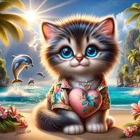 Ontmoet onze schattige kitten, genietend van de zon op een tropisch strand! Dit charmante kunstwerk vangt de onschuld en speelsheid van een katachtige die geniet van een avontuur aan zee. Perfect voor kattenliefhebbers en mensen die op zoek zijn naar een vleugje eigenzinnigheid. Dit kunstwerk zal je dag zeker opvrolijken.