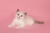 Schattig ragdoll kitten met blauwe ogen liggend op een roze achtergrond