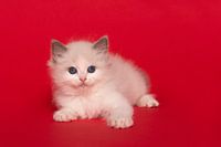 Over ‘Schattig ragdoll kitten met blauwe ogen op een rode achtergrond’ van Elles Rijsdijk