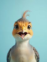 Charmant babyvogeltje met zijn snavel open op een levendige blauwe achtergrond, met zijn fijne gelaatstrekken en onschuldige charme