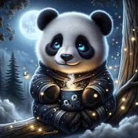 Een schattige panda met helderblauwe ogen zit comfortabel op een boomtak en houdt een dampende beker vast, versierd met panda-motieven. De scène speelt zich af tegen een nachtelijke achtergrond met een volle maan, gloeiende vuurvliegjes en een rustig bos, wat een serene en magische sfeer geeft.