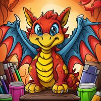 Een cartoon afbeelding van een rode draak met vleugels en een gele buik.