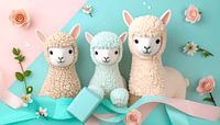 Drie schattige alpaca's, gemaakt van zeep, in zachte pastelkleuren in een ruimte met bloemen en slingers. De diertjes hebben lieve snuitjes en een zachte wollige vacht. Het beeld is met behulp van ai gegenereerd.