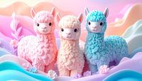 Drie schattige lieve alpaca's, gemaakt van zeep, in pastelkleuren staand tussen de pastelkleurige golven. Heerlijk zacht en heerlijk geurend. Het beeld is met behulp van ai gegenereerd.