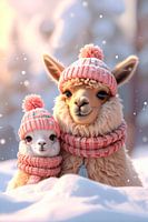 Mama alpaca en haar veulen, liggend in de sneeuw terwijl de sneeuwvlokken naar beneden dwarrelen. Ze hebben grof gebreide mutsen op en grof gebreide sjaals om tegen de kou, maar eigenlijk is dat niet nodig omdat ze een dikke vacht hebben. Ze hebben lieve schattige snuitjes, klaar om mee te knuffelen. Het beeld is met behulp van ai…