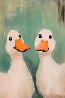 Twee levendig ogende eenden stralen een betoverende levenslust uit. Hun feloranje snavels en grote, glinsterende ogen geven ze een charmante uitdrukking. De zachte pastelkleuren van de achtergrond omlijsten dit vrolijke moment, dat je hart meteen verwarmt en doet glimlachen.