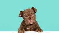 Cute old english bulldog puppy holding a white board looking at camera on a blue background