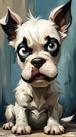 Dit kunstwerk toont een charmante hond met een ietwat chagrijnige uitdrukking, die een gevoel van melancholie en tederheid oproept. De gedurfde lijnen en expressieve kleuren roepen de stijl van popart op, waar eenvoud en heldere kleuren centraal staan. Het werk vertoont ook invloeden van stripkunst door de overdreven kenmerken en het speelse karakter van het dier.