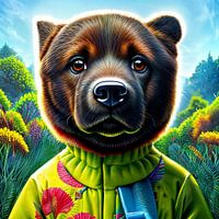 Dit schatje zal een glimlach op je gezicht toveren met zijn grote ogen en lieve houding. Deze zwarte hond in groene kleren is de perfecte aanvulling op je leven, met zijn levendige kleuren en grappige ontwerp.