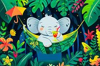 Dit vrolijke ontwerp brengt een tropische sfeer in elke kamer. Een schattige olifant ligt ontspannen in een hangmat, omringd door levendige, kleurrijke bladeren en bloemen. De heldere kleuren en speelse stijl maken het ideaal voor een kinderkamer of een gezellige hobbyruimte. Dit kunstwerk straalt rust, natuur en een vrolijke energie…