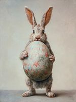 Een lieve, zachte haas staat rechtop en houdt een groot, beschilderd ei stevig tegen zich aan. Zijn blik is rustig en nieuwsgierig, alsof hij je uitnodigt om even stil te staan en te genieten van het moment. Het ei is rijk versierd met subtiele patronen en zachte kleuren zoals pastelblauw, warm roze en lichte aardetinten, wat het geheel…
