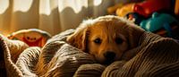 Het beeld van een gouden puppy, zachtjes gewikkeld in een warme deken, ontvouwt zich in een gezellige, knuffelige sfeer. Zijn nieuwsgierige blik straalt geborgenheid en onschuld uit, terwijl gouden zonnestralen door het raam naar binnen stromen. Dit betoverende motief is perfect voor de slaapkamer om een uitnodigende en gezellige sfeer te creëren.