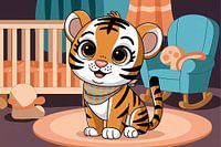 Deze charmante illustratie toont een vrolijke tijgerwelp die gezellig in een speels ingerichte kinderkamer zit. Met zijn grote, ronde ogen en zachte strepen straalt hij warmte en vriendelijkheid uit, perfect voor een kinderkamer. De tijger draagt een speelse sjaal, wat bijdraagt aan zijn lieve uitstraling. De achtergrond van het ontwerp toont een wieg, een comfortabele stoel, en verschillende zachte meubels, wat een gezellige en veilige omgeving suggereert. De levendige kleuren van oranje, blauw en wit maken het ontwerp uitnodigend en vrolijk. Deze illustratie zou perfect passen als decoratie in een babykamer, waar het zeker een glimlach op het gezicht van jong en oud zal toveren.