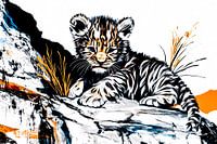 Dit ontwerp toont een prachtige tijgerwelp in een unieke, expressieve kunststijl. Het levendige kleurcontrast van zwart, wit, en oranje gecombineerd met abstracte elementen en texturen brengt een dynamische energie in het ontwerp. De wilde natuur wordt subtiel weergegeven met accenten van rotsachtige structuren en grasachtige details. Dit kunstwerk is een perfecte toevoeging voor elke ruimte, zoals een slaapkamer of eetkamer, en voegt zowel karakter als een vleugje avontuur toe aan je interieur. Een echte eyecatcher die zowel moderniteit als speelsheid uitstraalt.