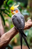 Deze levendige vogel straalt een charmante energie uit met een opvallende schok van felgeel haar en een zacht grijs verenkleed. Zijn rode wangen en elegante, lange staart voegen extra flair toe. Hij zit op een houten tak en ziet er mysterieus en nieuwsgierig uit, alsof hij in gedachten verzonken is.
