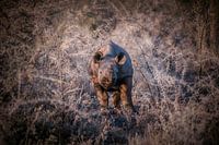 Het kalf van een zwarte neushoorn verscholen tussen de stekelige doorns van de bush in Etosha National Park.