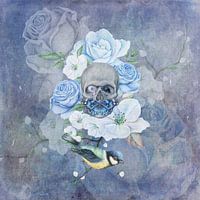 Het motief boeit door de vereniging van leven en dood. Menselijke schedel met bloemen, vlinder en pimpelmees.