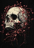Het motief toont een gedetailleerde menselijke schedel omringd door tere rode takken met delicate bloemen. De contrastrijke compositie van het bleke bot en de lichtgevende bloemen benadrukt op indrukwekkende wijze de vergankelijkheid van het leven. De donkere achtergrondkleur versterkt het diepte-effect en vestigt de aandacht op de fijne structuren van de schedel en de organische elementen, waardoor een harmonieuze balans van leven en dood ontstaat.