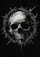 Een realistisch getekende schedel wordt omringd door een dreigende doornenkroon. Scheuren en schaduwen geven het een sombere diepte. De zwarte achtergrond benadrukt de morbide symboliek. De afbeelding speelt met religieuze en duistere symboliek en creëert een intens emotioneel effect.