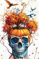 Een schedel met een pompoenhoofd en herfstachtige bomen, dat is weer eens wat anders! Dit kunstwerk is dan ook perfect voor iedereen die houdt van moderne horrorkunst. Perfect voor Halloween, een horrorthema of gewoon voor thuis. Geniet van dit mooie spooky tafereel en ontdek telkens weer nieuwe details.
