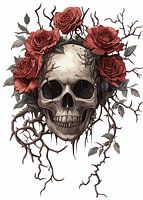 Ben je op zoek naar een donker bloemmotief? Dit ontwerp heeft een schedel omringd door rode rozen en takken - ideaal voor liefhebbers van donkere esthetiek. Dan is dit donkere motief met schedel en rozen echt iets voor jou! Perfect voor gothic fans of mensen die houden van morbide maar mooie ontwerpen.