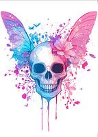 Een gedetailleerd kunstwerk toont een menselijke schedel die harmonieus samengaat met kleurrijke vlindervleugels en bloemenelementen. De linkerkant van de afbeelding schittert in koele blauwtinten, terwijl de rechterkant in warme roze en paarse tinten is uitgevoerd. Delicate bloemen, takjes en kleine vlinders omringen de schedel en creëren een surrealistische, bijna magische sfeer. Druppelende kleuren versterken het artistieke effect en geven het motief een dynamische uitstraling.