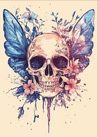 Het motief toont een zeer gedetailleerd geïllustreerde schedel, omringd door delicate bloemen en planten die organisch samensmelten met de schedel. Aan weerszijden van de schedel groeien grote, artistiek vormgegeven vlindervleugels, glinsterend in delicate blauwe en roze tinten. Kleurspatten en zachte aquarelverlopen versterken het artistieke, bijna surrealistische karakter van de afbeelding. Het contrast tussen vergankelijkheid en natuur symboliseert de verbinding tussen leven en dood in een harmonieuze compositie.