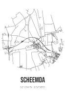 Zwart-witte landkaart, stratenplan of plattegrond van Scheemda. Scheemda is gelegen in de gemeente Oldambt, provincie Groningen. Op de stadskaart zijn alle openbare wegen in Scheemda opgenomen. Verder is de kaart voorzien van de coördinaten van het centrum van Scheemda.
