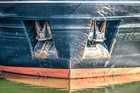 Symmetrisch beeld van de boeg van een schip met twee ankers in inkassingen in de romp.