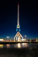 Industrieel erfgoed in de zeehaven van Harlingen in het Noorden van Nederland in de provincie Friesland. Hoog oprijzende kraan boven het water met reflecties in het wateroppervlak. Sfeervol uitgelichte industrie van transport en overslag tijdens de invallende nacht en op de achtergond de kleuren van de zonsondergang. hydraulische…