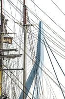 De masten van grote zeilschepen op de voorgrond als doorkijk voor de beroemde Rotterdamse Erasmusbrug waardoor er een speels lijnenspel ontstaat.
