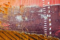 Deel van een roestige scheepsromp met hoofdkleuren rood en bruin en zwemen van geel en paars, met twee lasnaden en het witte reliëf van het diepgangsmerk.