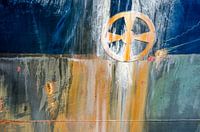 Kleurrijk fragment van een scheepsromp, met twee verschillende tinten blauwe verf, het boegschroefsymbool en een lasnaad, roest- en kalkstrepen, en met krassen en andere beschadigingen.