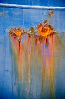 Close-up van een felblauwe scheepsromp met lasnaad, twee roestplekken en veelkleurige strepen van roest en vuil
