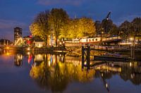 De Oude Haven in Rotterdam met de historische scheepswerf De Koningspoort tijdens het blauwe uur op een windstille herfstavond.