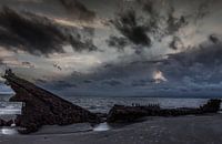 Oud houten scheepswrak, Captain James A. Duffy, in de provincie Zeeland in Nederland.