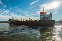 Schepen varen af en aan via de havens van de stad Rotterdam zo ook deze varend richting Rotterdam.