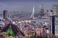 We zien hier het Scheepvaartkwartier, ook wel het Nieuwe Werk genoemd, een negentiende eeuwse uitbreidingswijk van Rotterdam, met links de groenstrook van de Parklaan en links de recente Westerlaantoren. Verder op de achtergrond de Nieuwe Maas, de Kop van Zuid, het Noordereiland en natuurlijk de Erasmusbrug.