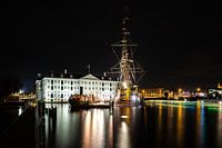 De replica van het VOC zeilschip de Amsterdam, afgemeerd voor het nationaal scheepvaart museum in de haven van het het Oosterdock. Sfeervol verlichte avond scene van de maritieme geschiedenis van Nederland uit de gouden Eeuw in een foto gefotografeerd.