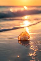 Zachte golven spelen rond een delicate schelp die glinstert in het gouden licht van de avondzon. Het delicate patroon weerspiegelt de warme kleuren van de lucht, terwijl de afkoelende branding rustig verhalen over de zee vertelt. Een moment van rust, gevangen tussen hemel en water, dat ons herinnert aan het hart van de ziel.