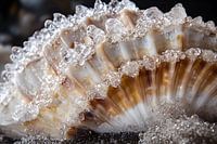 Dit prachtige beeld toont een close-up van een schelp, bedekt met glinsterende kristallen die de natuurlijke details en texturen van de schelp naar voren brengen. De mix van zachte aardetinten en het sprankelende effect van de kristallen geven een rustige en klassieke uitstraling, perfect om toe te voegen aan een interieur met een natuurthema. De gedetailleerde weergave van de kristallen en het natuurlijke patroon van de schelp maakt dit kunstwerk een eyecatcher in elke ruimte. Geschikt voor diverse interieurs, maar vooral voor diegenen die houden van verfijning en natuurlijke elementen in hun inrichting.