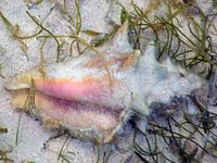Onderwater, schelp met klein visje. Deze foto is gemaakt onderwater bij Lac Cai op Bonaire. De koninginneschelpen zijn beschermd. Ze zijn bijna uitgestorven.