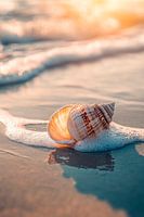 Op de zachte oever, waar het water de kust kust, rust een prachtige schelp. Zijn spiraalvormige schelp gloeit in warme, aardse tinten, terwijl het schuim van de zee er een delicate glans op achterlaat. Stralen zonlicht geven het landschap een magische gloed en de zachte branding vertelt verhalen van verre duikers en mysterieuze diepten.