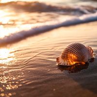 Zacht glinsterende golven spelen rond de gebogen vorm van een schelpachtige schoonheid die glinstert in het warme licht van de avondzon. De delicate strepen vertellen over verre kusten en geheime oceaandieptes. Een moment van stilte, gevangen in de wisselwerking tussen water en zand, doet de kijker dromen van avonturen aan zee.