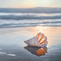 Zachte golven spelen rond een prachtige schelp die schittert in het gouden licht van de avondzon. De spiraalvormige elegantie en delicate oppervlaktestructuur weerspiegelen de rust en magie van het leven aan de kust. Een kostbaar relikwie dat de verhalen van de zee bewaart en je uitnodigt om de drukte van alledag te vergeten.