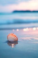 Zachte golven strelen het glinsterende zandstrand, terwijl een schelpvormige schatkist, delicaat gekleurd in zachte pasteltinten, in het vochtige zand blijft liggen. Het spiraalvormige patroon vertelt over geheime oceaanreizen, terwijl het schemerlicht een dromerige sfeer creëert. Een moment van rust en natuurlijke schoonheid dat de verbeelding prikkelt en de geest uitnodigt om af te dwalen.